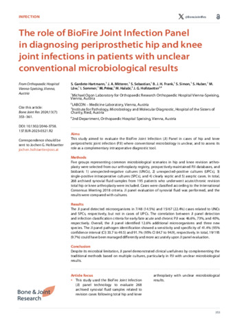 The role of BioFire Joint Infection Panel in diagnosing periprosthetic hip and knee joint infections in patients with unclear conventional microbiological results.Tools Hartmann, Susana und Mitterer, Jennyfer Angel und Sebastian, Sujeesh und Frank, Bernhard J.H. und Simon, Sebastian und Huber, Stefanie und Löw, Marcellino und Sommer, Ian und Prinz, Mojgan und Halabi, Milo und Hofstaetter, Jochen (2024) The role of BioFire Joint Infection Panel in diagnosing periprosthetic hip and knee joint infections in patients with unclear conventional microbiological results. Bone Joint Res.. Vorschau 2046-3758.137.BJR-2023-0321.R2.pdf Herunterladen (3MB) | Vorschau