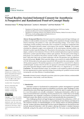 Virtual Reality-Assisted Informed Consent for Anesthesia: A Prospective and Randomized Proof-of-Concept Study.Tools Simon, Sebastian und Opfermann, Philipp und Hofstaetter, Jochen und Marhofer, Peter (2024) Virtual Reality-Assisted Informed Consent for Anesthesia: A Prospective and Randomized Proof-of-Concept Study. J Clin Med.. Vorschau jcm-13-06096 (1).pdf Herunterladen (904kB) | Vorschau