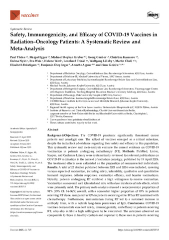 Safety, Immunogenicity, and Efficacy of COVID-19 Vaccines in Radiation-Oncology Patients: A Systematic Review and Meta-Analysis.Tools Thöne, Paul und Egger, Margot und Gruber, Michael Stephan und Gruber, Georg und Kasassov, Christina und Nyiri, Dalma und Weis, Eva und Werl, Helene und Trinkl, Leonhard und Lilleby, Wolfgang und Clodi, Martin und Bräutigam, Elisabeth und Dieplinger, Benjamin und Aigner, Annette und Geinitz, Hans (2025) Safety, Immunogenicity, and Efficacy of COVID-19 Vaccines in Radiation-Oncology Patients: A Systematic Review and Meta-Analysis. Vaccines, 13 (7). ISSN 2076-393X Vorschau Thöne Safety, Immunogenicity Efficacy COVID -19 Vaccines vaccines 2025.pdf Herunterladen (1MB) | Vorschau