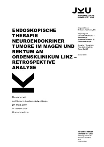 ENDOSKOPISCHE THERAPIE NEUROENDOKRINER TUMORE IM MAGEN UND REKTUM AM ORDENSKLINIKUM LINZ – RETROSPEKTIVE ANALYSETools Holzmann, Michaela (2024) ENDOSKOPISCHE THERAPIE NEUROENDOKRINER TUMORE IM MAGEN UND REKTUM AM ORDENSKLINIKUM LINZ – RETROSPEKTIVE ANALYSE. Masterarbeit thesis, Johannes Kepler Universität Linz. Vorschau NET Magen Rektum Holzmann.pdf Herunterladen (5MB) | Vorschau