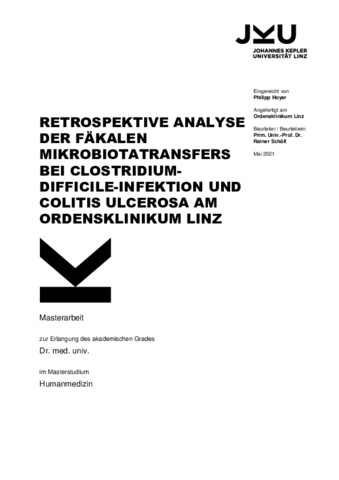 Retrospektive Analyse der fäkalen Mikrobiotatransfers bei Clostridium-difficile-Infektion und Colitis ulcerosa am Ordensklinikum LinzTools Hoyer, Philipp (2021) Retrospektive Analyse der fäkalen Mikrobiotatransfers bei Clostridium-difficile-Infektion und Colitis ulcerosa am Ordensklinikum Linz. Masterarbeit thesis, Universität Linz. Vorschau Stuhltransplantation Hoyer.pdf Herunterladen (595kB) | Vorschau